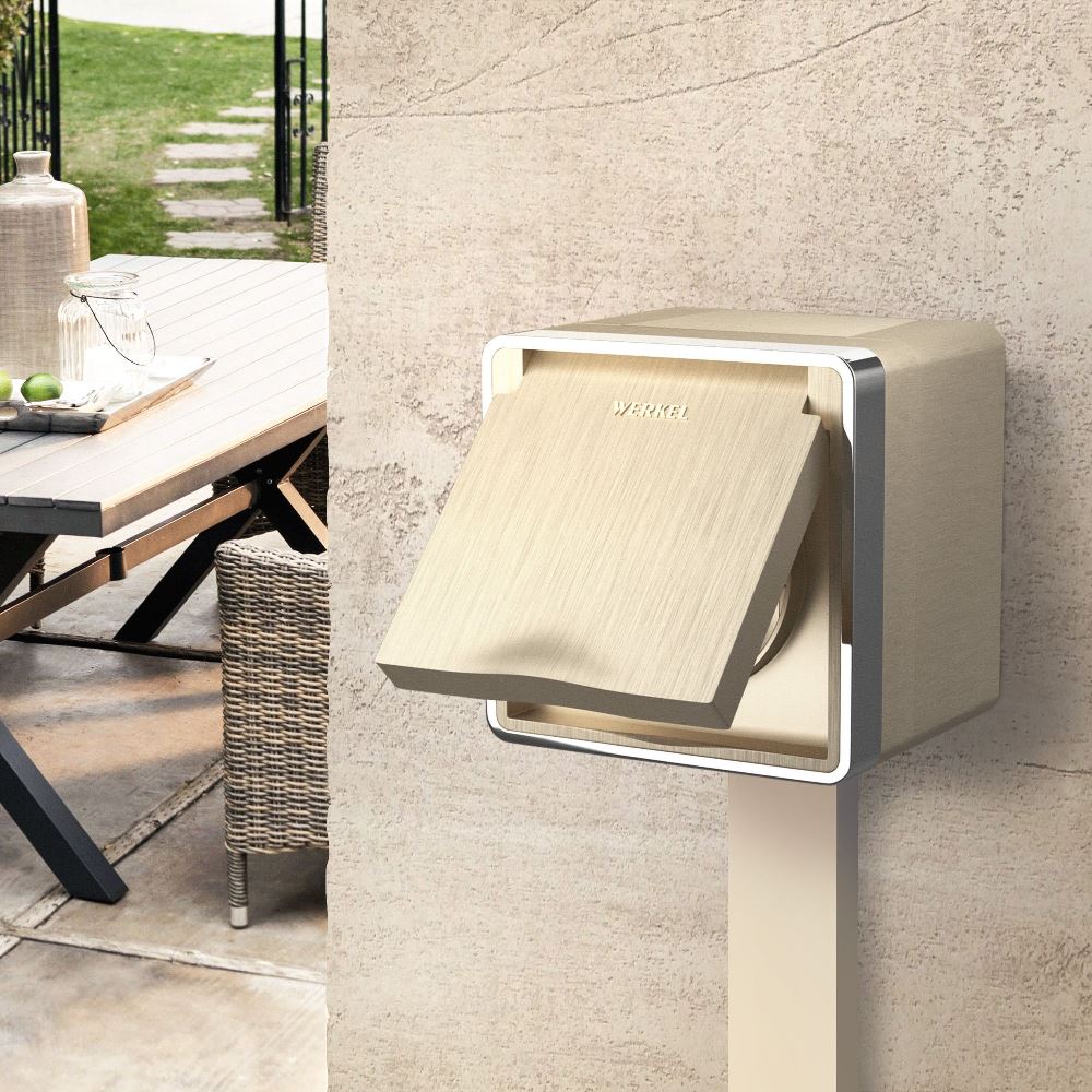 Розетка накладная влагозащищенная Werkel Gallant с заземлением, шторками и защитной крышкой Шампань рифленый W5071210