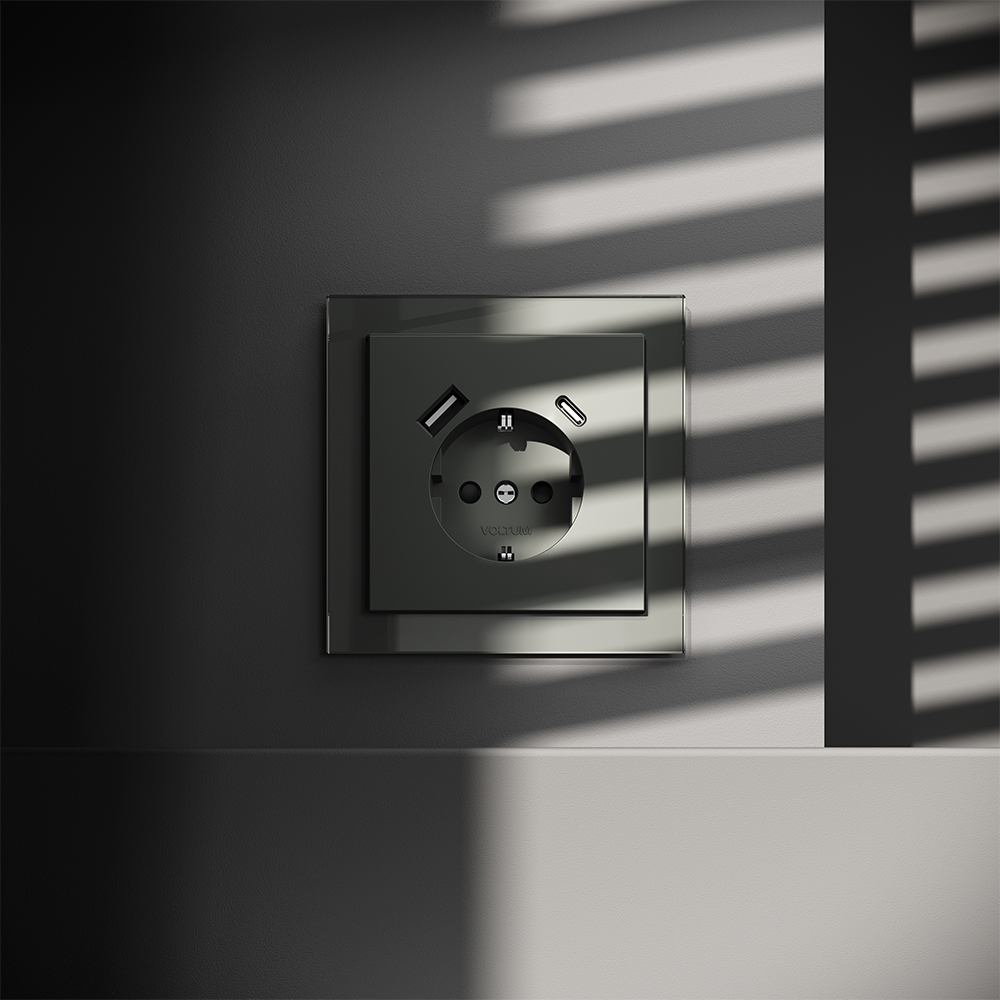 Розетка встраиваемая Voltum S70 с заземлением, шторками и USB A+C Титан VLS040506